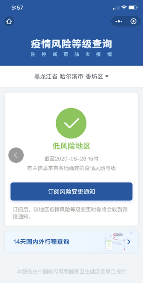 国务院客户端小程序防疫行程卡查询示例:(微信扫一扫进入)