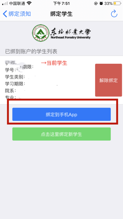 填写个人信息后,点击“提交”便可顺利完成捆绑(注意:第3项请选择捆绑学号)。提交后可退出网页,在APP上进行登录。