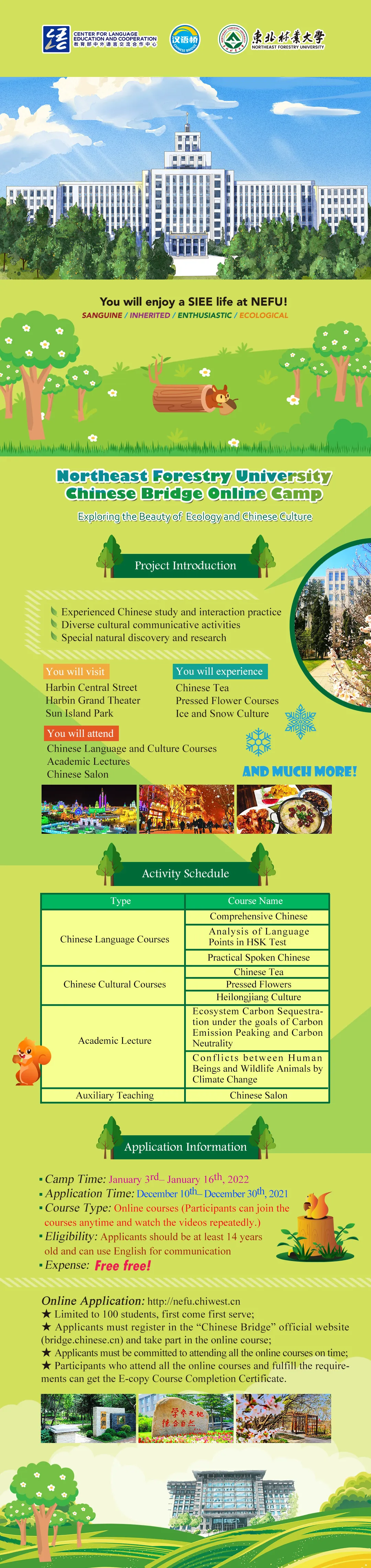本项目全程免费,学员参与全部教学活动后,将获得国际交流学院颁发的电子结业证书。所有学员须在2021年12月30日前提交信息表(详见附件)并在“汉语桥”官方网站(bridge.chinese.cn)及东北林业大学招生系统(http://nefu.chiwest.cn)完成注册。
