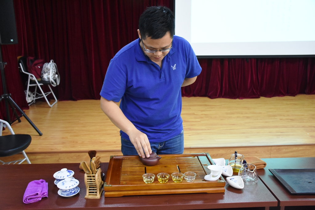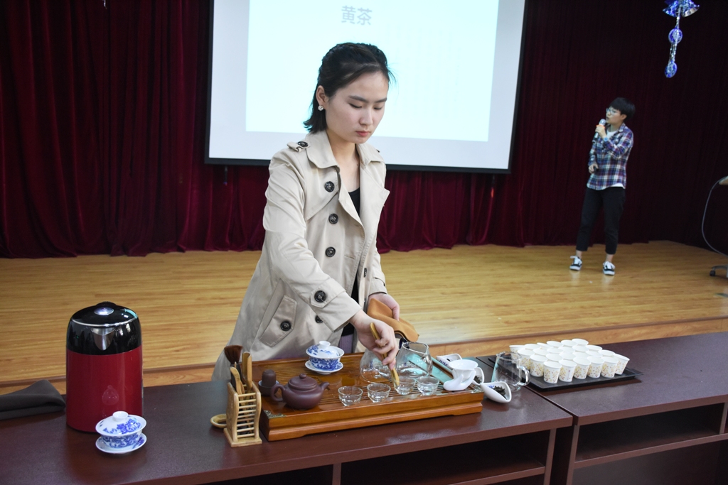 5月23日14:00时,汉语文化沙龙活动正式开始。首先,主持人彭韵从“茶”字的演变、中国茶文化的起源与发展以及中国六大茶类简介三个方面讲解了中国茶文化的基本知识。然后,茶艺志愿者吴梦萍与吕闪闪采用盖碗与紫砂壶两种不同的冲泡器皿对白茶、红茶和黑茶三款茶叶进行了冲泡,展示了不同的冲泡手法。
