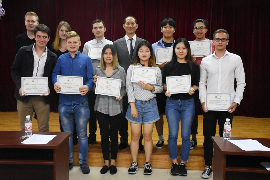6月26日下午,2018年春季学期进修生结业仪式暨2018届学历生毕业典礼在国际交流学院多功能厅举行。国际交流学院院长乔凤合教授、副院长岳喜华教授等同志及44名来自俄罗斯、韩国、苏丹、刚果(金)、巴基斯坦等17个国家和中国台湾的学生参加了仪式。