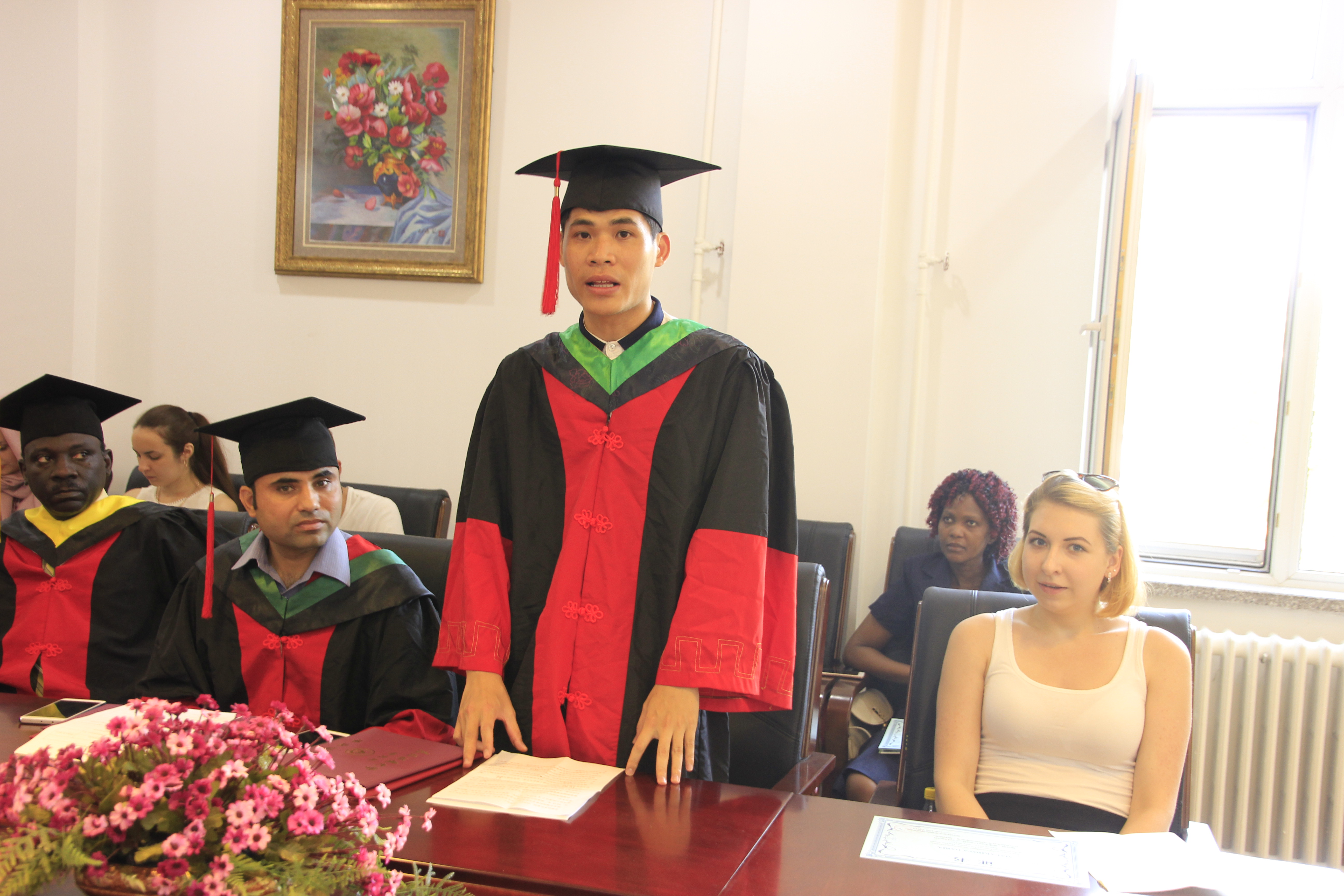 2017年7月6日下午,2017年春季学期进修生结业仪式暨2017届学历生毕业典礼在国际交流学院会议室举行。国际交流学院院长乔凤合教授、留学生教务科李月梅科长等同志及26名来自俄罗斯、韩国、日本、马拉维、越南、苏丹、巴基斯坦和中国台湾省的学生参加了仪式。