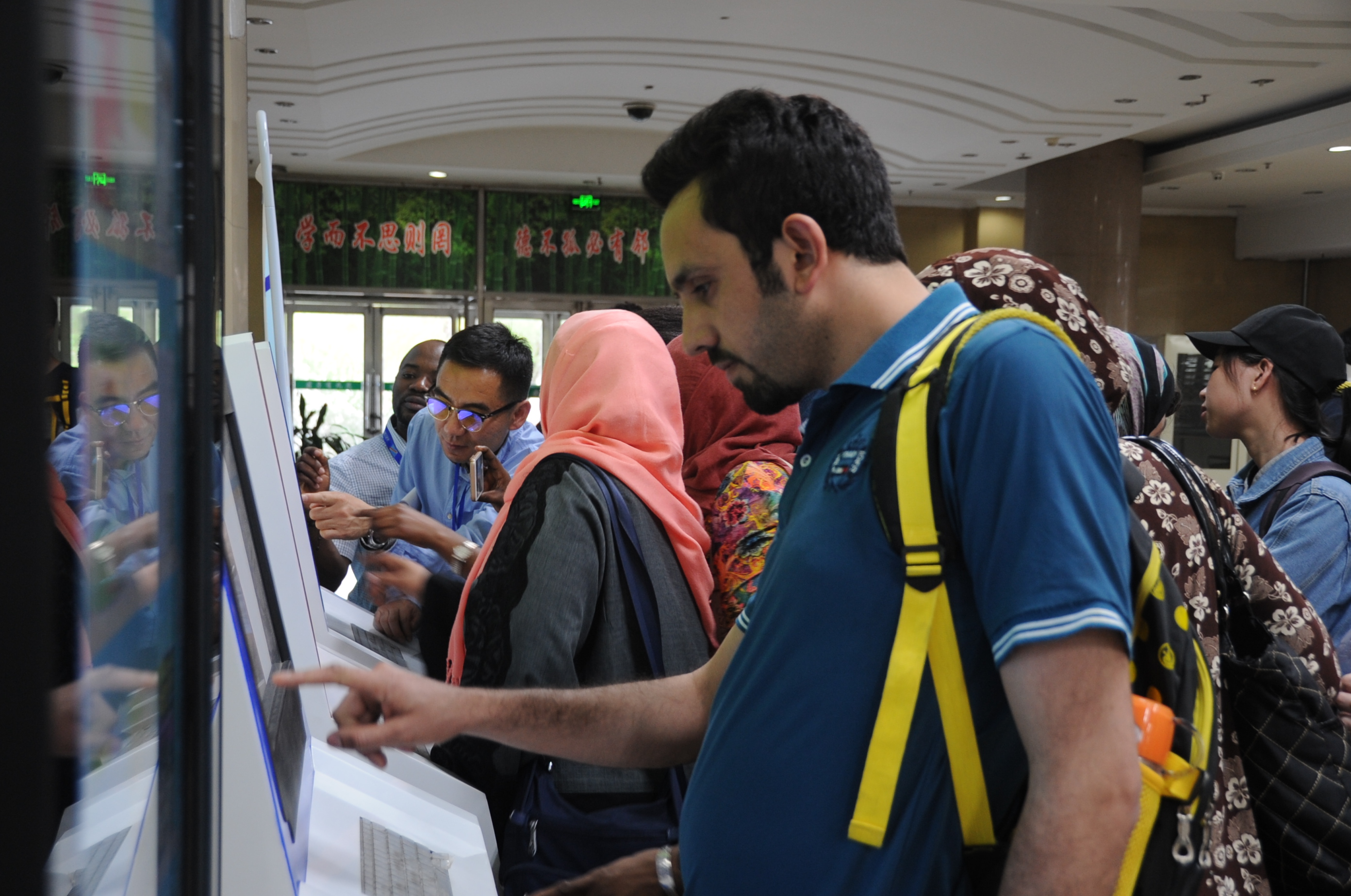 在六楼,工作人员向留学生介绍了留学生自主学习区,在外文图书流通区,工作人员向留学生们介绍了馆藏资源、外文书籍的布局、借阅办理流程等。在二楼自动检索机处,工作人员耐心地指导留学生们利用检索机查询书籍。留学生每到一处,工作人员都为他们进行了细致的讲解,并对他们提出的各种问题给予解答。针对留学生们提出的图书馆馆藏之外书籍的需求问题,王立海馆长明确答复:留学生向图书馆相关工作人员提供所需书籍名称即可,图书馆会对所需书籍进行统一采购。