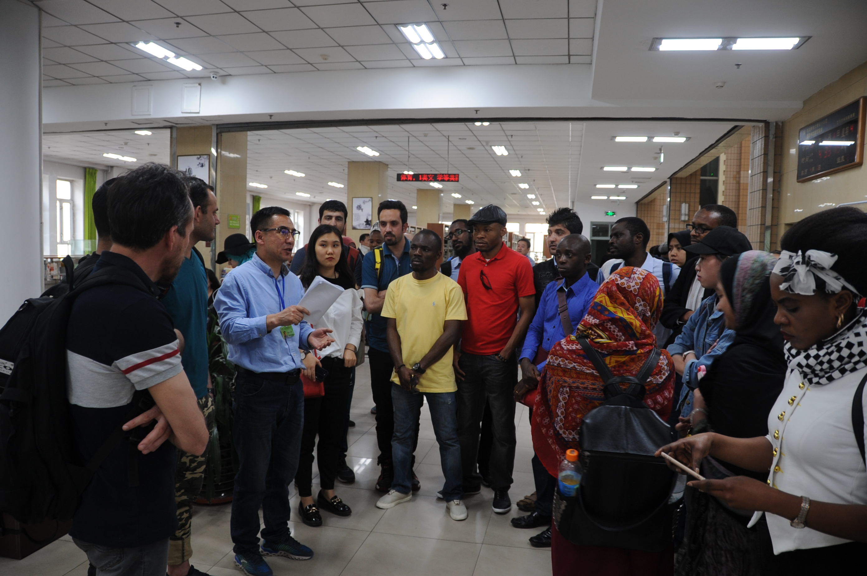 在图书馆A栋六楼大厅,馆长王立海用英语向留学生们做了自我介绍,以幽默的语言对留学生们表示热烈欢迎,并简要介绍了图书馆的情况。