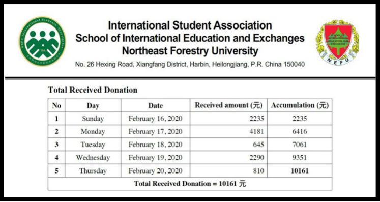 2020年2月16日至2月20日,为了支持中国抗击新冠肺炎疫情,东北林业大学国际学生联合会发起了“口罩捐赠”募捐行动。5天的“口罩捐赠”活动中,共有85名国际学生捐款,捐款总额为10161元。