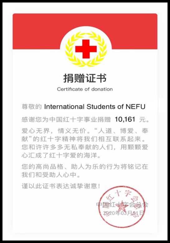 3月2日,学生联合会将一份完整的募捐报告和中国红十字总会出具的募捐证书发布到国际学生微信群中,国际学生纷纷点赞,并表示相信中国一定能够战胜疫情,期待安全、健康地回到哈尔滨,继续在东林愉快的学习生活。