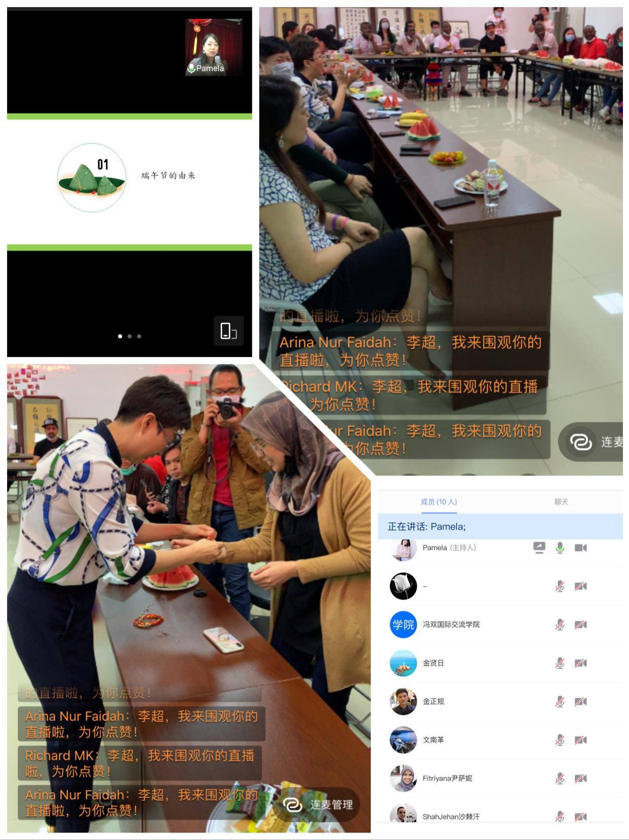 为了让每一名国际学子都能感受到节日氛围,活动前期,学院通过微信公众号和小程序科普了端午知识,活动现场开通了腾讯会议和钉钉视频直播平台,老师们化身主播,带领线上同学们一起话端午。