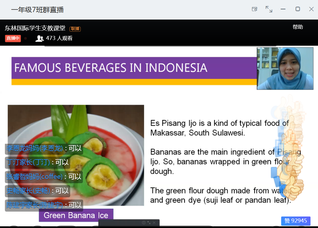 直播课上,庄天宁结合精心制作的PPT,从印尼地貌特征、国情现状、风土人情等方面全面展示了这个“千岛之国”的风貌。学生们认真聆听,不时发布留言,参与互动。
