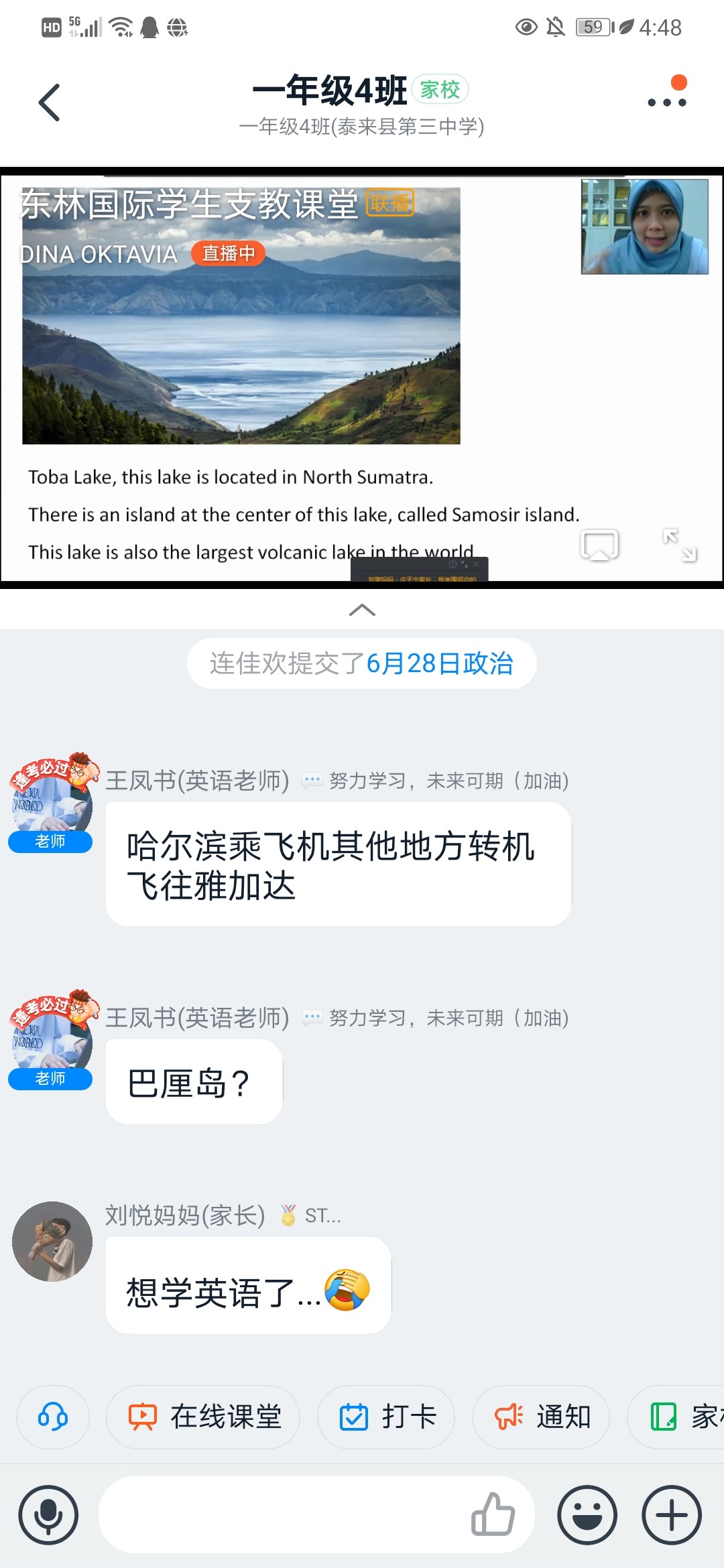 “我叫庄天宁,来自印度尼西亚,是东北林业大学生态学学科的博士生,今天我要用英文为大家介绍美丽的印度尼西亚,让我们一起来学习吧!”6月28日下午,我校国际学生支教团成员庄天宁,通过钉钉直播平台与泰来三中近500名师生开启了“云游”印尼模式。