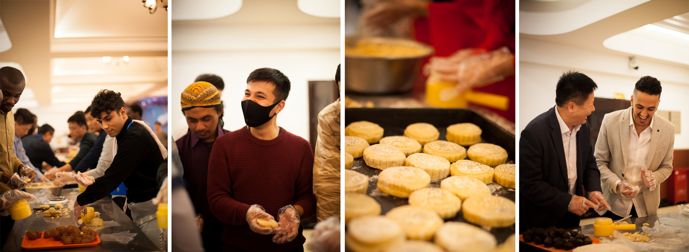 中秋意浓,月饼飘香。活动伊始,国际交流学院副院长岳喜华教授向全体师生致以中秋祝福,希望大家在东林大家庭中互相关心、互相帮助,愉快度过大学美好时光,并预祝本次活动圆满成功;汉语教师郑昕用英汉双语为大家介绍了中秋的来历和传说,讲解了中国人“明月寄相思,佳节家团圆”的传统习惯。活动现场,学校后总食堂的师傅们早已为国际学生准备好了制作月饼的面馅,由各国同学亲手和面、包馅,用模具印花的枣泥、川酥等月饼陆续被送进烤箱。