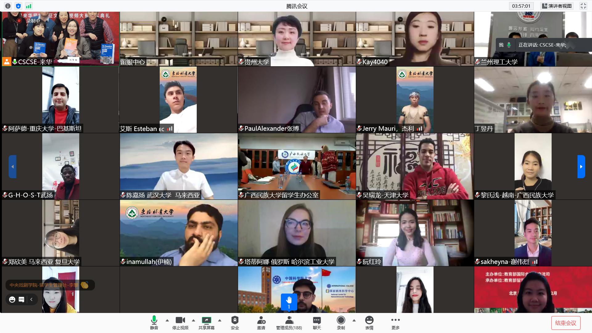 12月8日,第四届来华留学生征文暨短视频大赛颁奖典礼以线上形式成功举办,我校国际学生的短视频作品获得特等奖1项、特色奖3项,学校获评优秀组织奖。获奖学生通过线上参加了颁奖典礼。