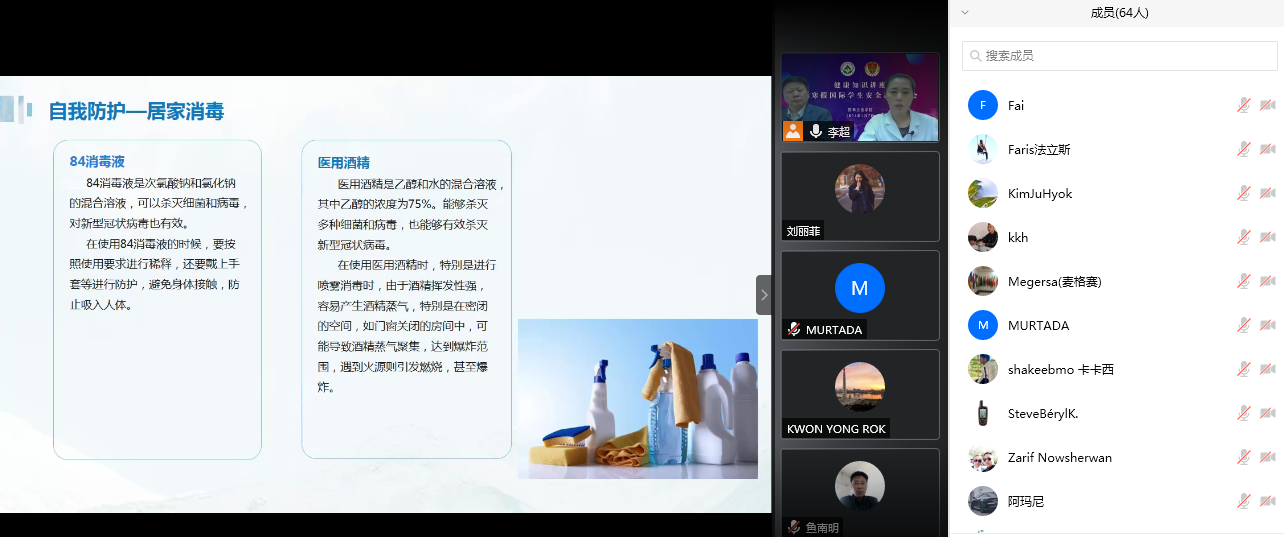 1月7日下午2时,国际交流学院国际学生疫情防控知识讲座暨寒假安全教育大会在线举行,国际师生通过腾讯会议APP,共同聆听专业医师讲授冬季常见传染病知识,了解应对新冠病毒的防护举措,并学习了学校寒假疫情防控要求及相关安全注意事项。