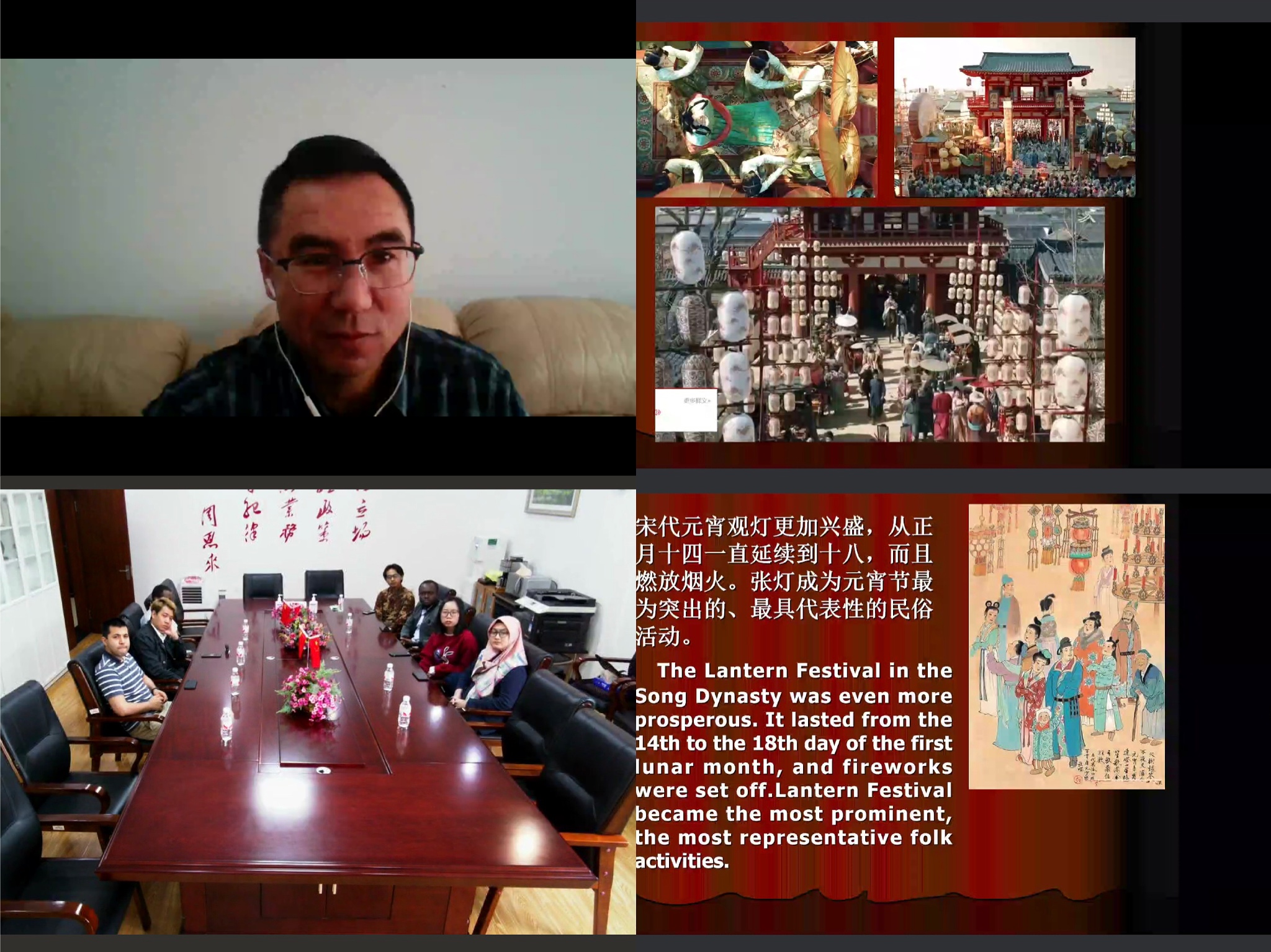 “大雨下在横山上,是汉字‘雪’字”,来自朝鲜的崔现雄同学快速说出了谜底。猜灯谜环节,同学们争先恐后给出答案。“灯谜,真是一种有趣好玩的游戏,里面蕴藏的中国文化深深吸引着我。”崔现雄表示。线上参与的同学们也纷纷竞猜灯谜,并留言送上元宵节祝福。
