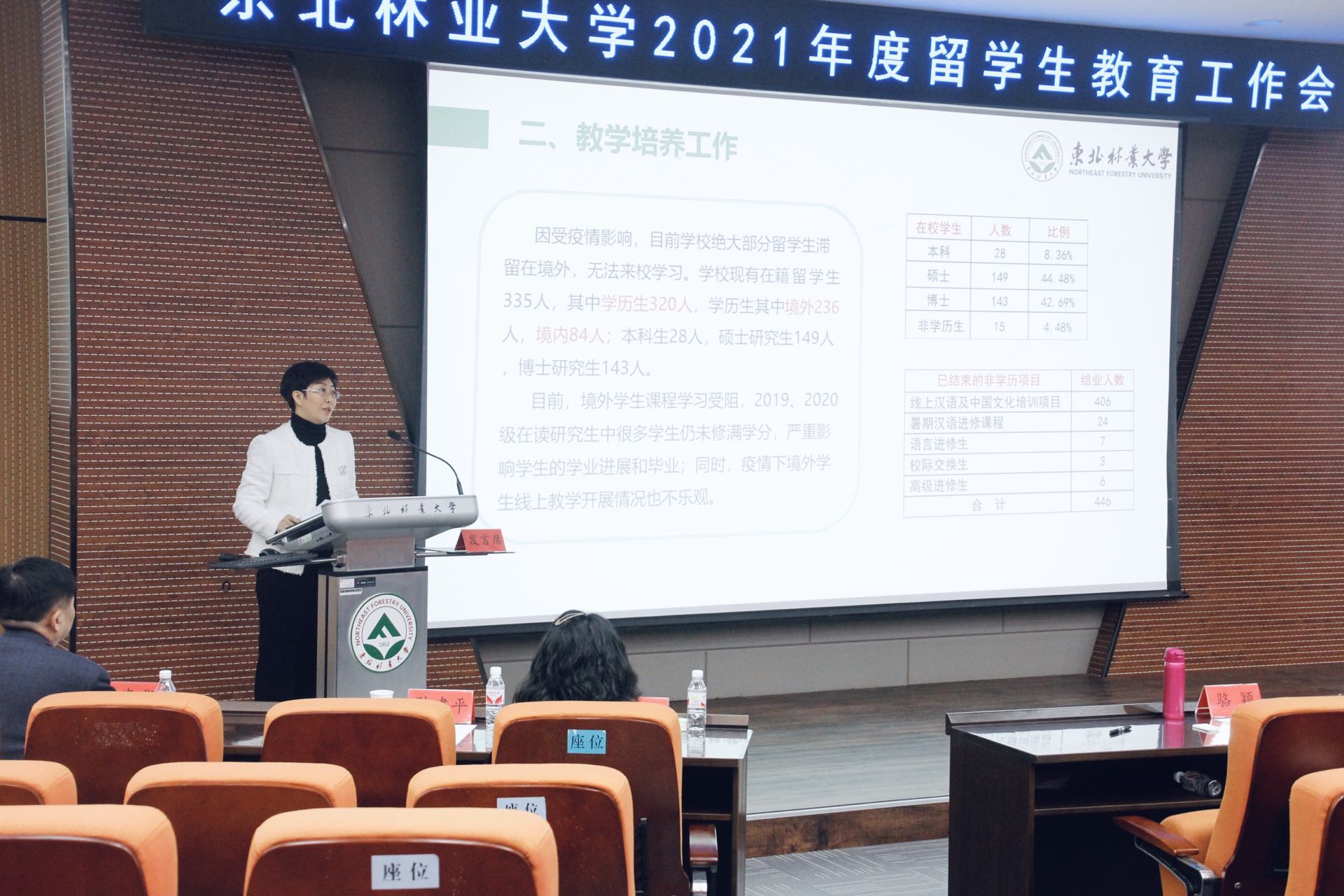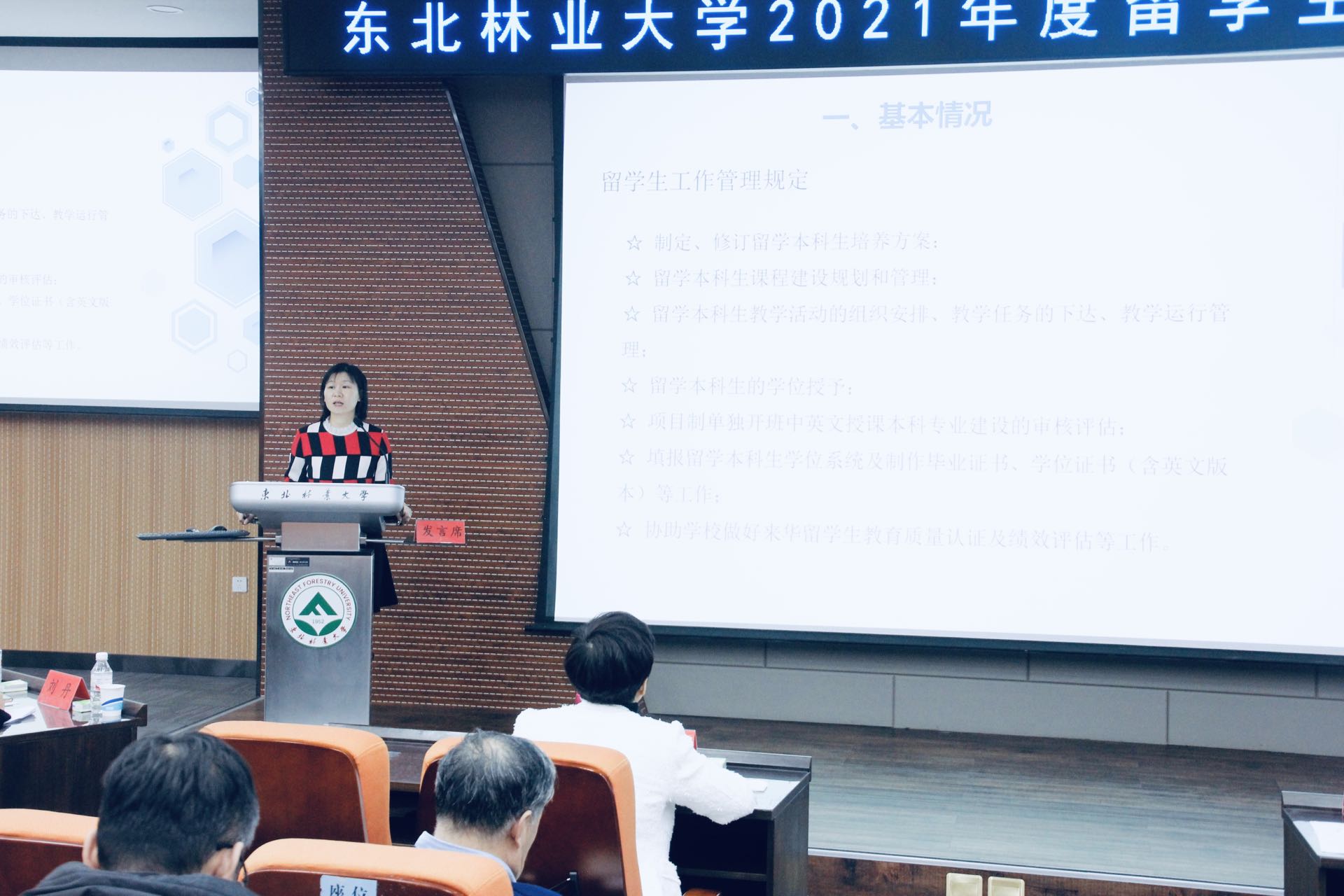 会上,国际交流学院院长骆颖从招生宣传、教育培养、管理服务、质量认证等方面对2021年学校留学生教育工作开展情况进行了介绍,并就当前存在问题和下一步重点工作进行了分析研判。国际学院副院长刘丹、研究生院副院长王新政、教务处副处长葛冰先后就学校新出台的《东北林业大学留学生工作管理规定(试行)》(以下简称管理规定)相关内容进行了解读。