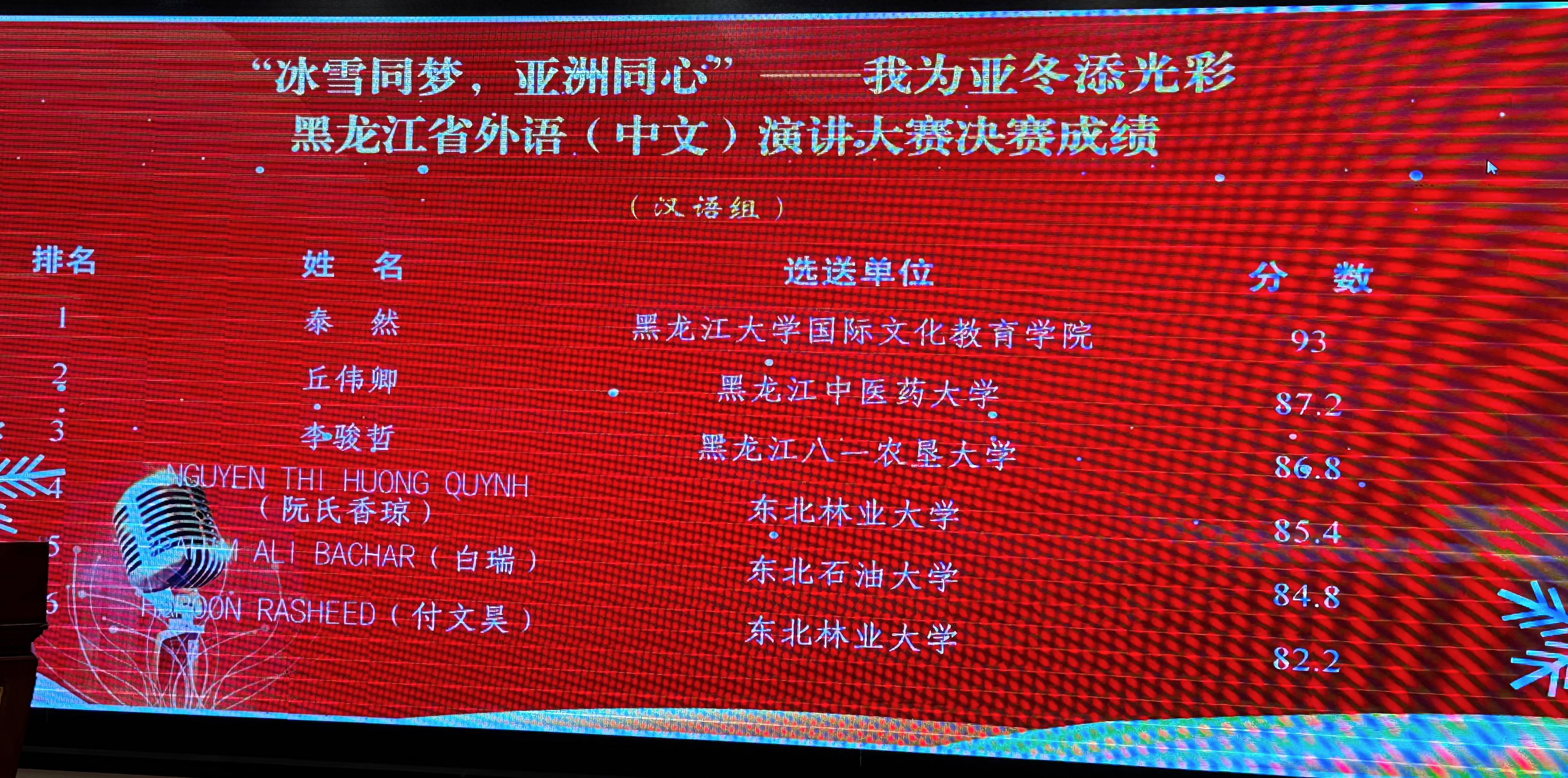 近日,“冰雪同梦,亚洲同心”——我为亚冬添光彩黑龙江省外语(中文)演讲大赛决赛在哈尔滨举行,我校共5名留学生参加,其中越南籍硕士研究生阮氏香琼、巴基斯坦籍硕士研究生付文昊分获大赛汉语组三等奖,另外三名留学生获得最佳参与奖。