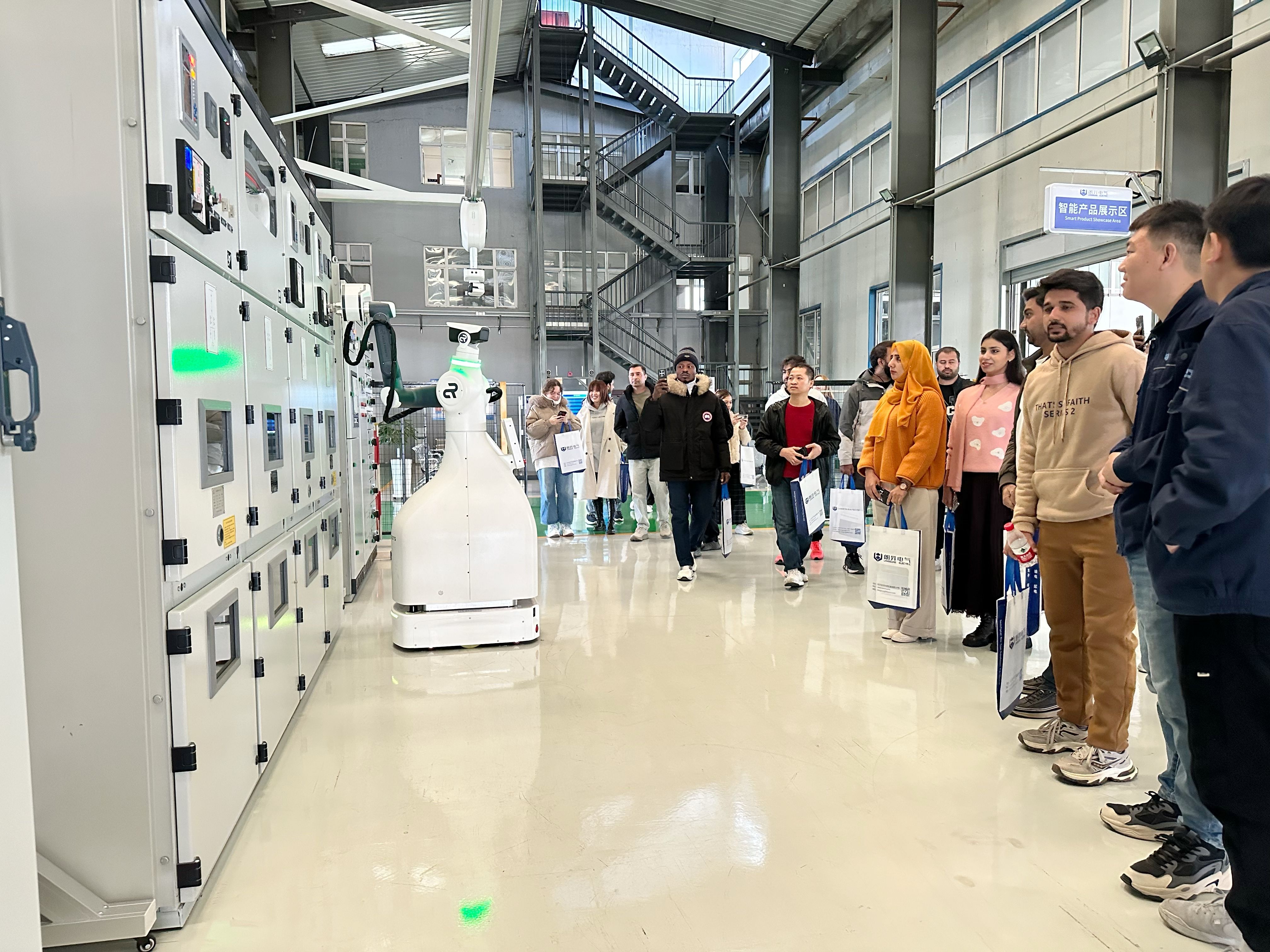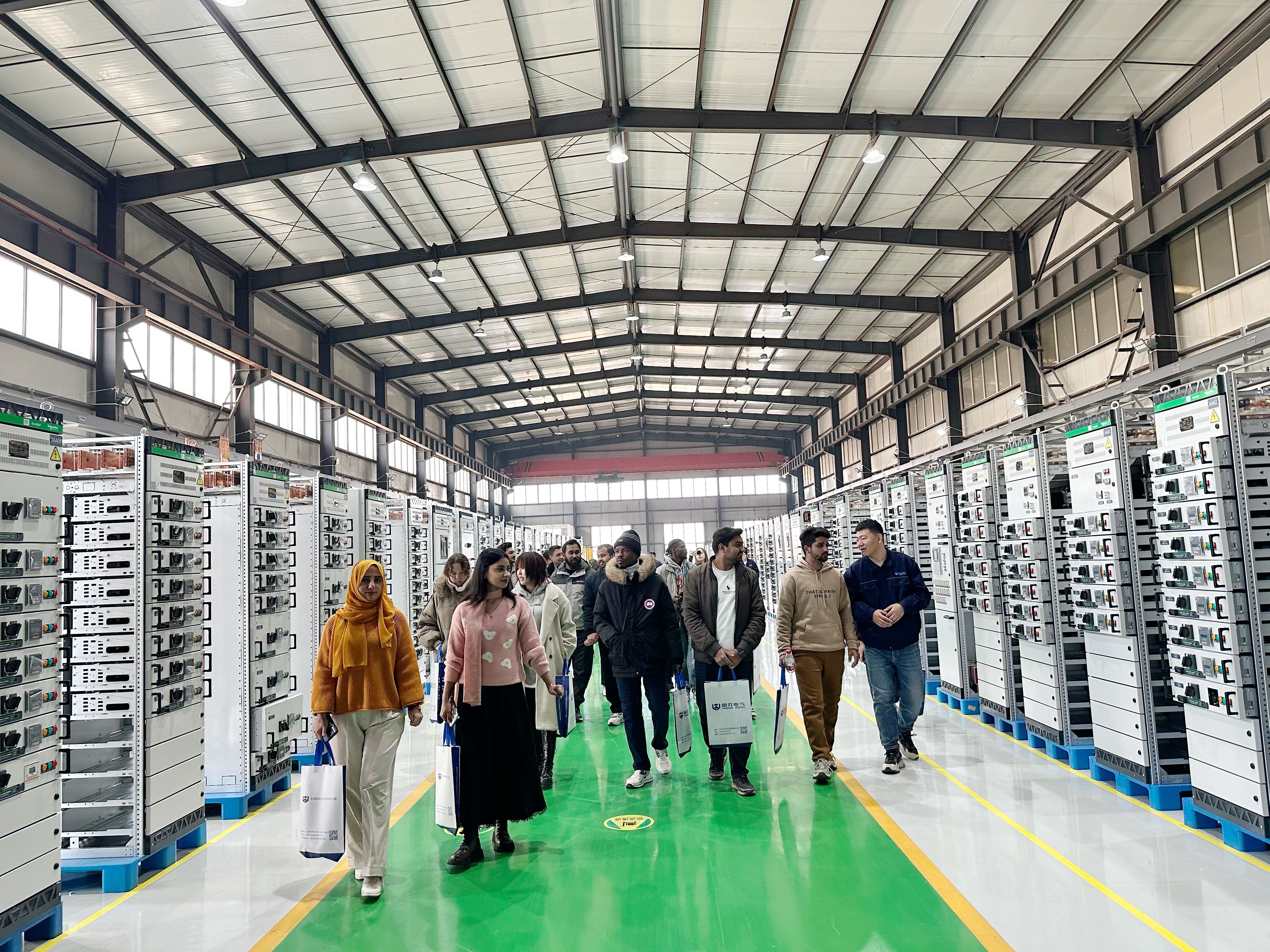 留学生们通过中文宣传资料和PPT演示,系统了解了朗昇电气的发展历程与技术实力。他们沿着特设参观路线,实地考察了非标柜生产区、高低压柜生产区、智能产品展示区等核心区域。在智能配电源网荷储展间,海外事业部部长姜广春与留学生们就新能源技术应用进行了深入交流。