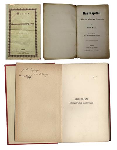 左上图为1848年《共产党宣言》德文第一版。右上图为1867年《资本论》德文第1卷第一版。下图为恩格斯的题字赠书《社会主义从空想到科学的发展》,1892年英文版。 中央党史和文献研究院供图