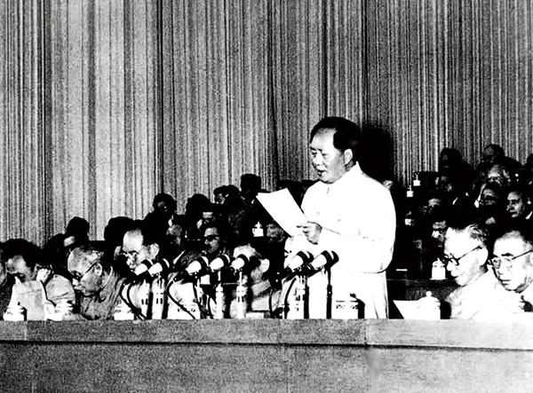 1956年9月15日至27日,中国共产党第八次全国代表大会在北京举行。大会提出的党和国家主要任务是集中力量发展生产力的思想,对于社会主义事业的发展和党的建设具有长远的重要的意义。图为毛泽东在大会上致开幕词。 新华社发