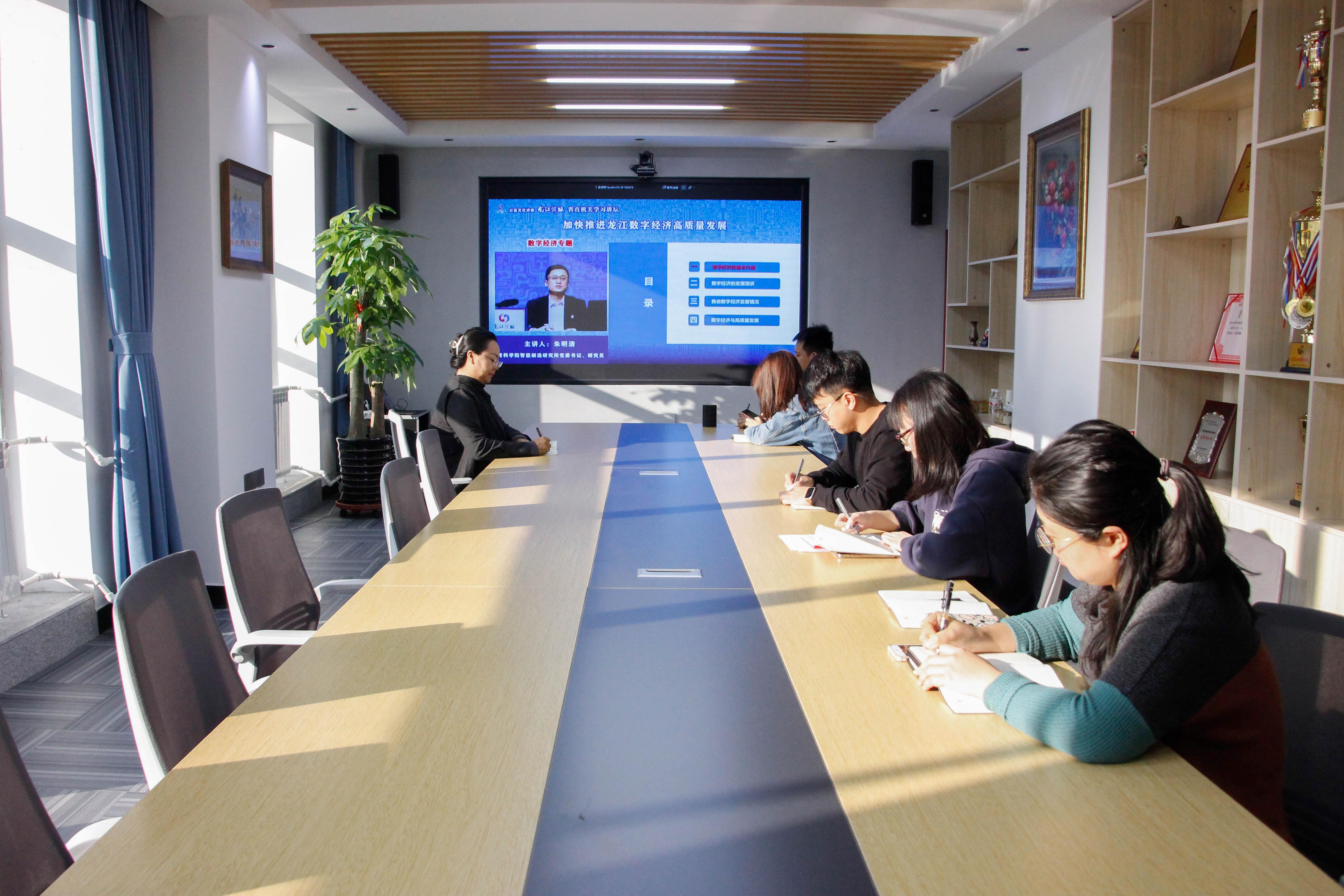 11月9日,国际交流学院直属党支部组织教职工在学院会议室集中收看“龙江讲坛”第 757 期暨“省直机关学习讲坛”第 37 讲“数字经济”专题讲座,受疫情影响居家健康监测的教职工也在线上同步进行学习。