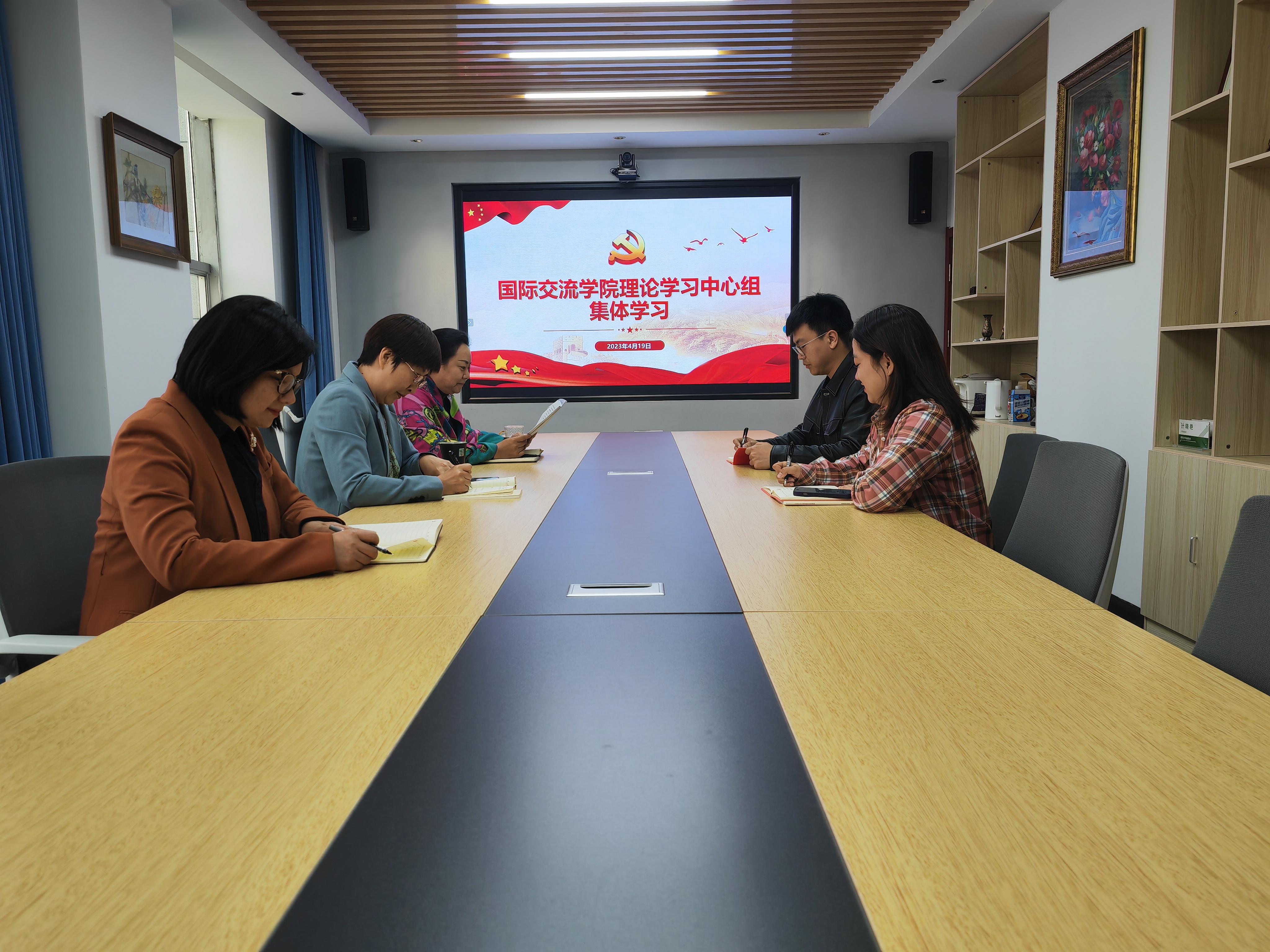 为深入学习贯彻党的二十大精神, 提升中心组成员对当前国际形势的认识,4月19日,国际交流学院理论学习中心组在学院会议室开展集中学习活动。