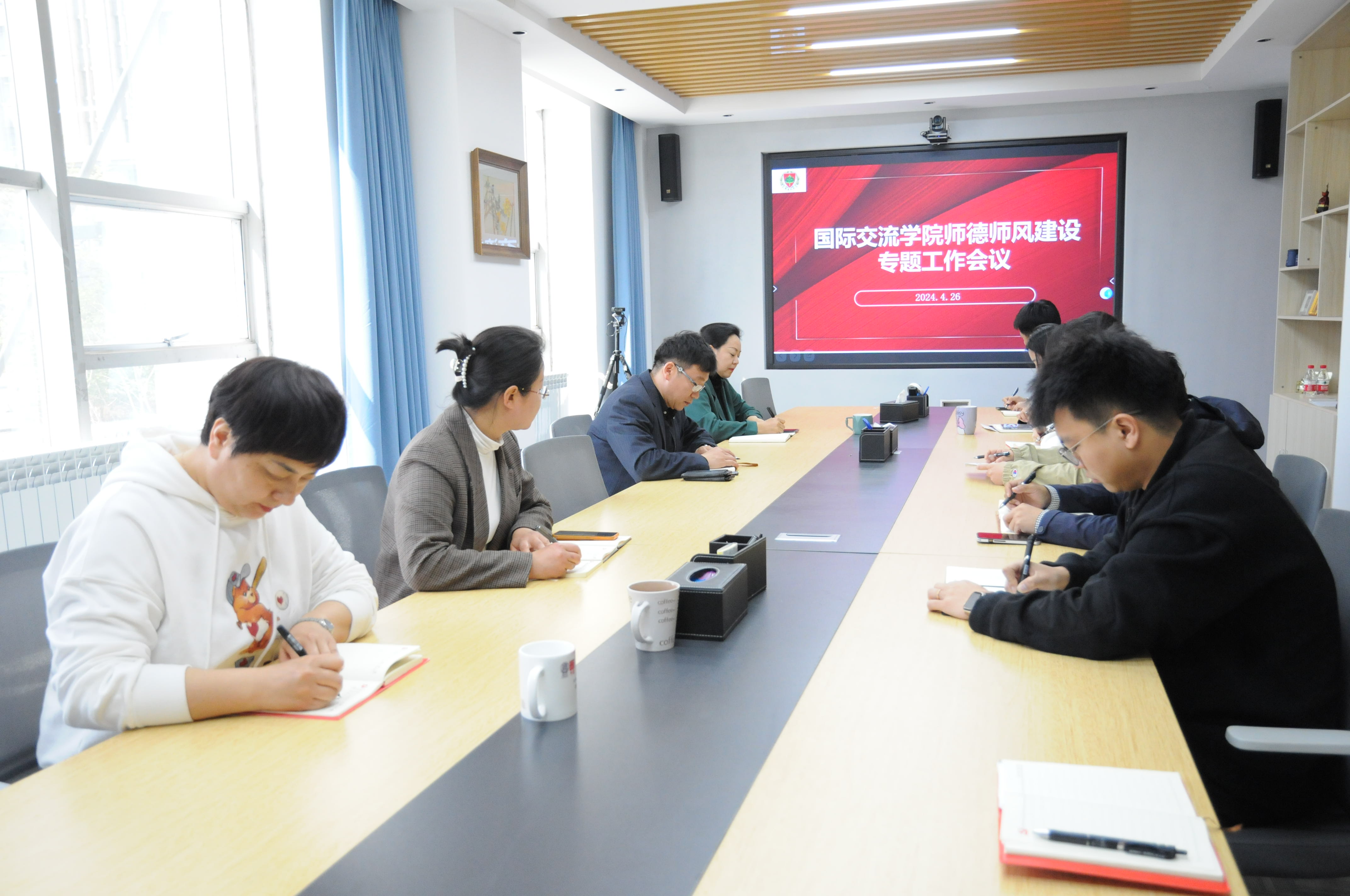 4月26日,国际交流学院组织全体教职工在学院会议室召开师德师风建设专题工作会,研究部署学院师德师风建设工作,引导教职工敬业立学、崇德尚美,营造风清气正的育人环境。
