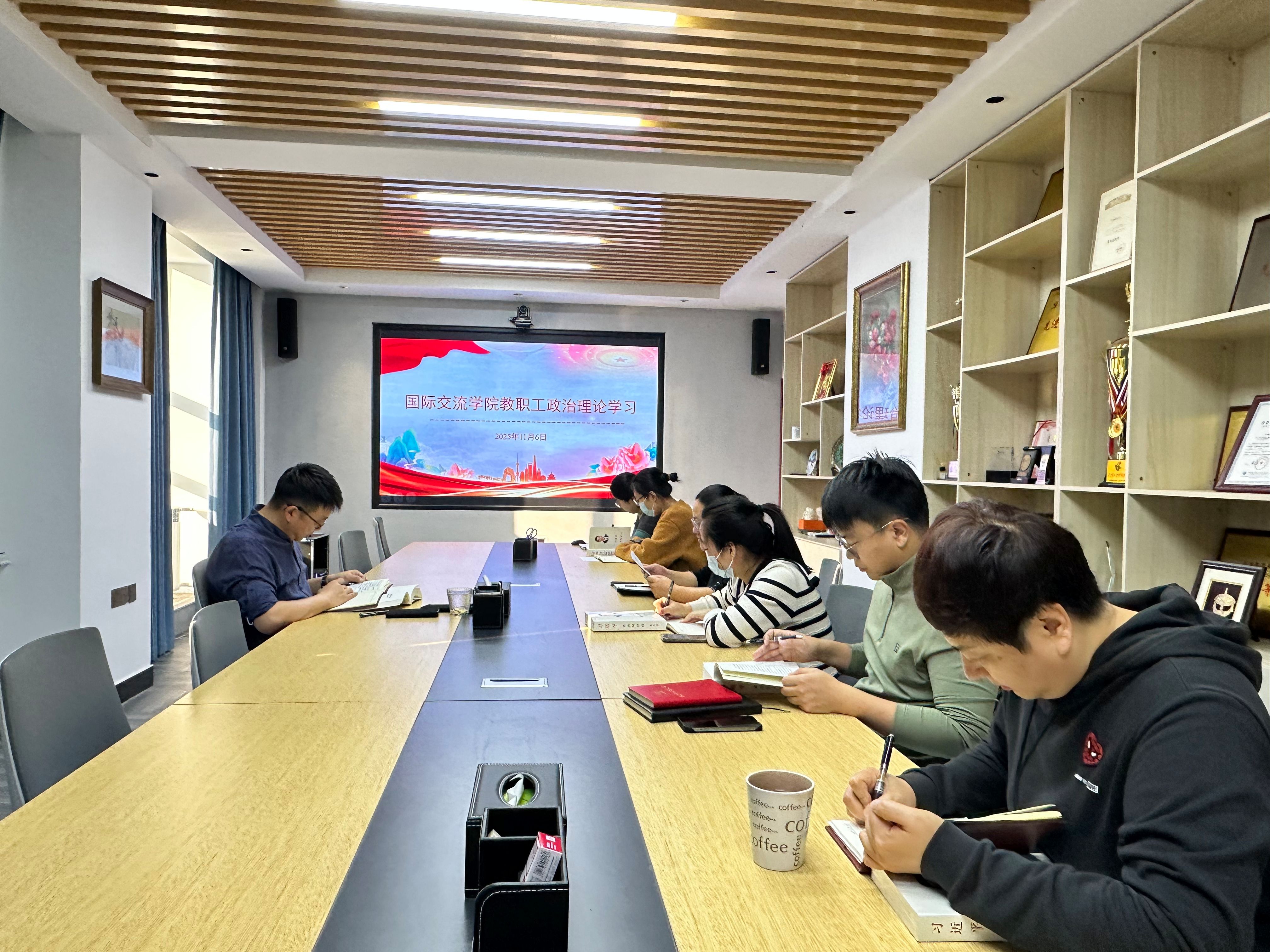 11月6日,国际交流学院直属党支部组织全体教职工在二楼会议室开展政治理论学习。