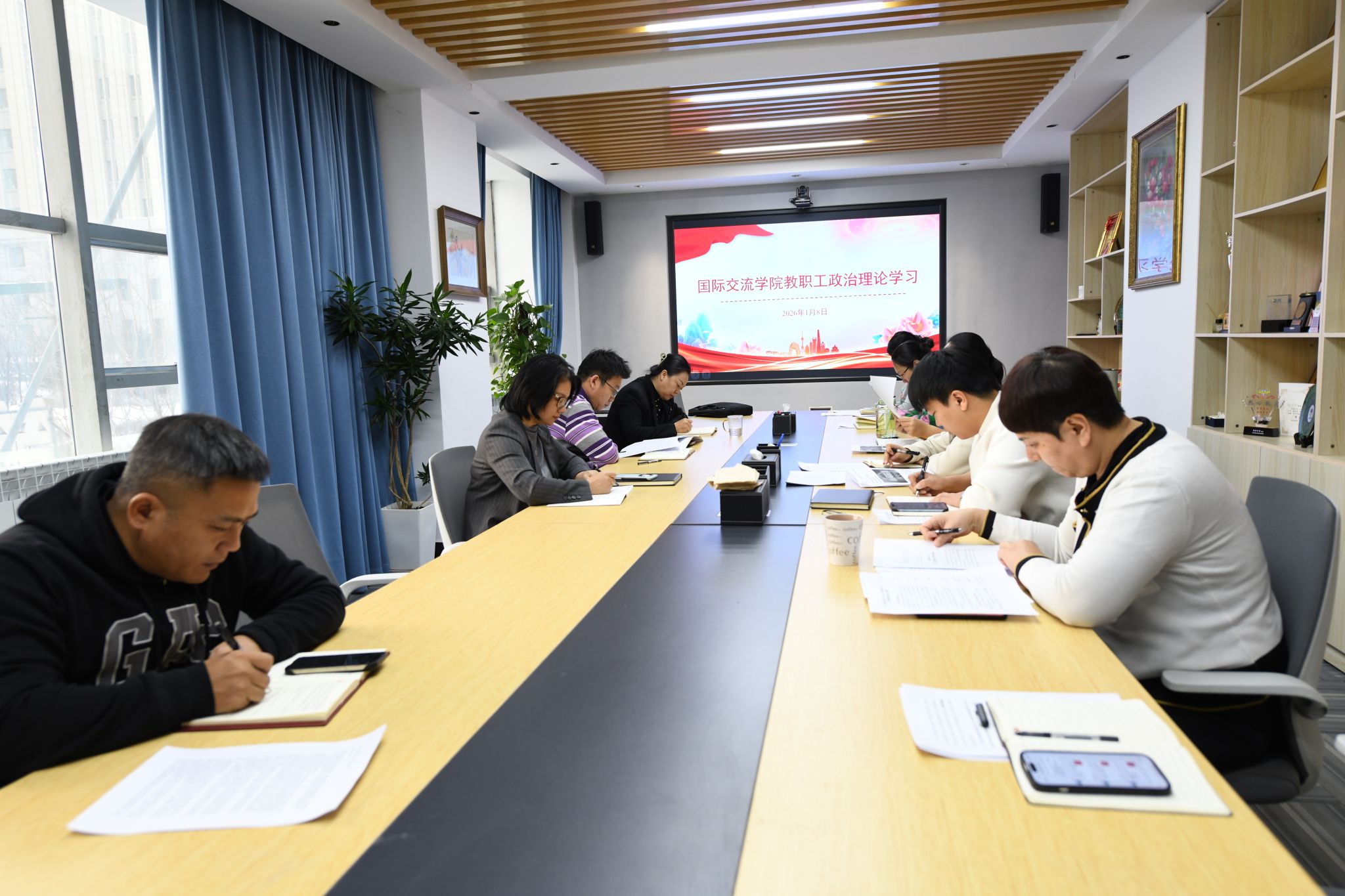 1月8日,国际交流学院直属党支部组织全体教职工在二楼会议室开展政治理论学习。